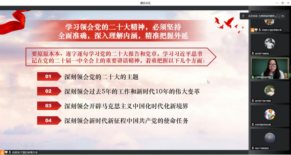 首先,学生会主席团成员谢思颖带领团学成员深入学习贯彻党的二十大精神,通过阐述大会主题、大会意义、大会时间线三个方面,启示团学成员必须要增强“四个意识”,坚定“四个自信”,做到“两个维护”。此外,谢思颖还特别强调学习领会党的二十大精神的要求,全体团学成员要原原本本、逐字逐句学习党的二十大报告,准确领会党的二十大精神实质,观全景、知全貌、明全义。