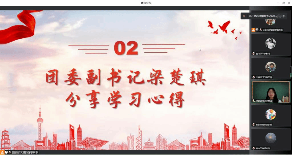 其次,团委副书记梁楚琪分享学习党的二十大心得。梁楚琪围绕党对当代青年关怀与希冀展开叙述,向团学成员阐述了“青年强则国家强”的道理,通过回望先辈的奋斗经历,感召团学成员要继往开来、勇往直前,绽放最美的青春之花。最后,梁楚琪勉励团学成员要不断深入学习贯彻党的二十大精神,端正工作态度,积极进取,接过时代的接力棒,跑出加速度。交流合作部负责人李欣怡引用习近平总书记对青年的寄语来阐述学习党的二十大精神的体会,分享了当代青年应将小我融入大我,将创新精神融入团学工作中。组织部负责人何丹丹向团学成员介绍了中国共产党当前及未来的目标,呼吁团学成员踔厉风发,笃行不怠。