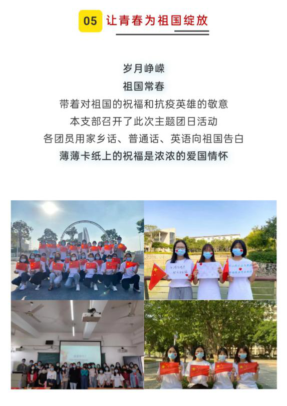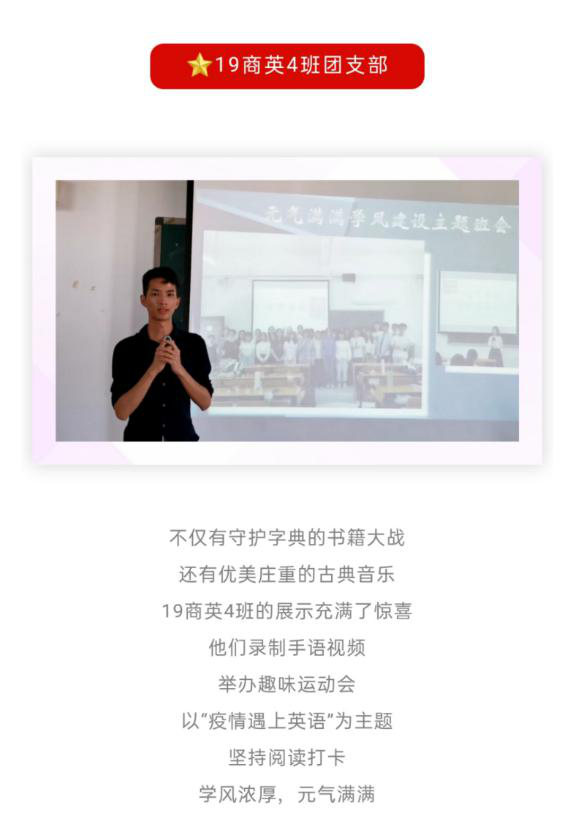 此次成果展中,各团支部活动内容丰富,涵盖了文体、学习、生活等多个方面,展现了外院学子的青春朝气,充分契合了此次“让青春为祖国绽放”的活动主题。各团支部举办了如线上学习抗击疫情先进典型事迹、开展国家安全教育班会、朗诵配音等活动。更有团支部别出心裁,以班级内同学的视角分享疫情期间无数个“李华”的一天,并借此机会带领团支部成员了解认识了各个地区的特色美食,让人垂涎欲滴的同时也展现了丰富的地域文化。另外,本次团日活动成果展也得到了评委们的赞许与肯定。其中梁婷老师对各团支部的团日活动的点评到:各班级结合了专业特色,在疫情防控、志愿服务、专业学习等方面开展了丰富多彩的、符合学生需求的活动,希望同学们在接下来的主题团日活动中、牢牢把握专业建设与思想政治引领与实践,开展让团员青年喜闻乐见的整体团日活动。