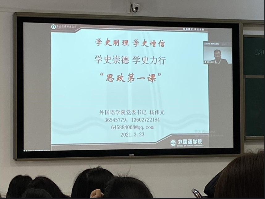 随后, 徐玲院长以《学党史、知使命,做一名有时代担当的大学生》为题,从《习近平谈治国理政》第三卷切入,引导同学们要坚持理论联系实际的马克思主义学风,同时紧密结合当下时政,做到知行合一,学以致用。她指出,作为一名外语人,在日常生活中要关注国际舆论,辩证的看待外媒报道,要学好党史,学好专业,讴歌时代,弘扬优秀的传统文化,传承中国精神,利用自身优势用讲好中国故事,传播好中国声音,成为一名有时代担当的大学生。