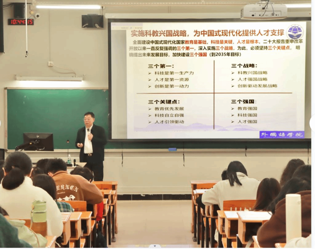 杨伟光以《新时代大学生为中国式现代化建功立业》为题,以“中国式现代化的五个特征”为切入点,带领学生深刻认识党和国家新时代10年的伟大变革及其重大意义,领悟好掌握好运用好习近平新时代中国特色社会主义思想,进一步明确坚持以中国式现代化全面推进中华民族伟大复兴,牢牢把握以伟大自我革命引领伟大社会革命的重要要求,牢牢把握团结奋斗的时代要求,通过全面准确学习领会党的二十大精神,争做新时代好青年。