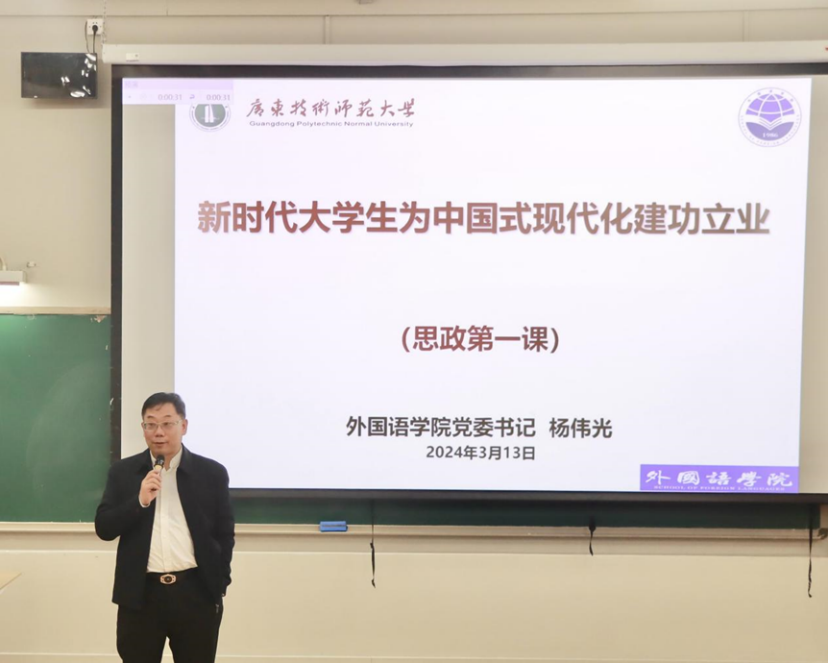 为深入学习贯彻党的二十大精神,引导广大学生深刻理解中国式现代化的本质要求,3月13日上午,学院党委书记杨伟光在白云校区三教107为学生讲授“思政第一课”。学院党政领导班子相关成员、辅导员和学生代表200余人现场聆听了讲课。