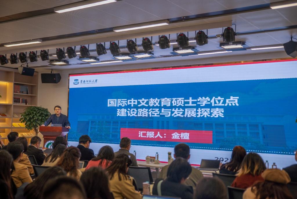 华南师范大学国际文化学院院长金檀教授以“国际中文教育硕士学位点建设路径与发展探索”为主题发表了主旨演讲。他详细介绍了华南师范大学国际文化学院在国际中文教育硕士学位点建设方面的内容,涵盖了培养目标、学位标准、培养特色、师资队伍、科学研究、教学科研支撑、人才培养以及服务贡献等方面。他进一步交流了该学科最新探索出的革新举措,以“数智化国际中文教学课程构建与教材研发”为实证,详尽阐述了操作策略并进行了深入的反思与总结。