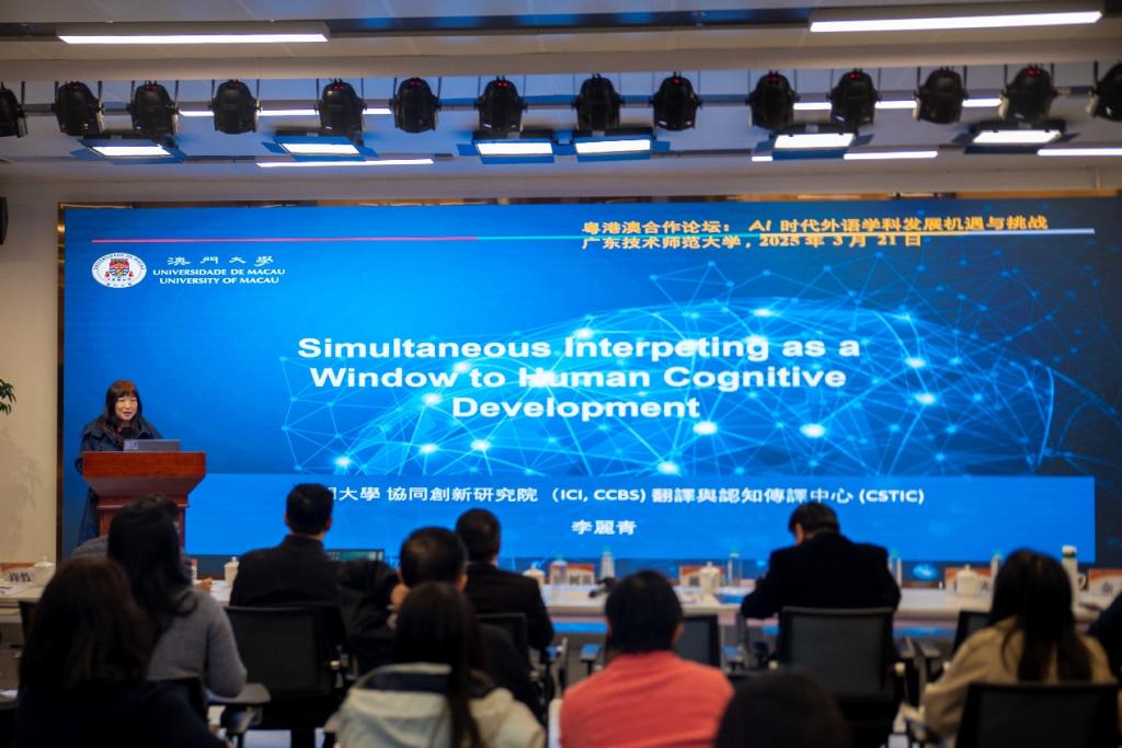 澳门大学人文学院助理院长李丽青教授以“同声传译:人类认知发展的窗口”为题作主旨发言。她介绍了她以往基于同声传译所做的人类认知方面的研究,解释了此类研究在语言教学、认知发展和康复方面的重要作用,并探讨了语言活动在人工智能时代的重要性。