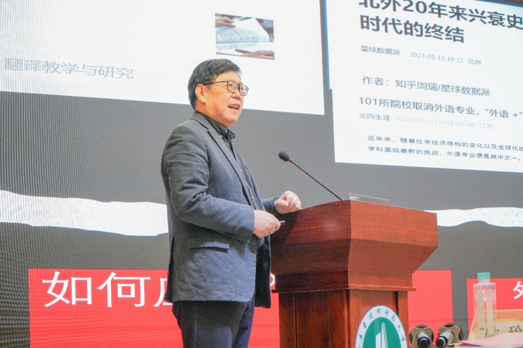 华南理工大学国家级课程思政教学名师韩金龙教授以“新文科、大外语:外语教育的变革之路”为题作主旨发言。他提出,“四新”建设、课程思政以及人工智能的快速发展,对外语学科建设和大学外语教学提出了新的挑战。建设新文科,实施大外语,被视为应对挑战、推动外语教育变革的关键举措。他认为深入思考并积极探索新文科之“新”、大外语之“大” 人工智能为外语教学带来的机遇与挑战等问题,是新时期外语学科建设和外语教学改革成败的关键。