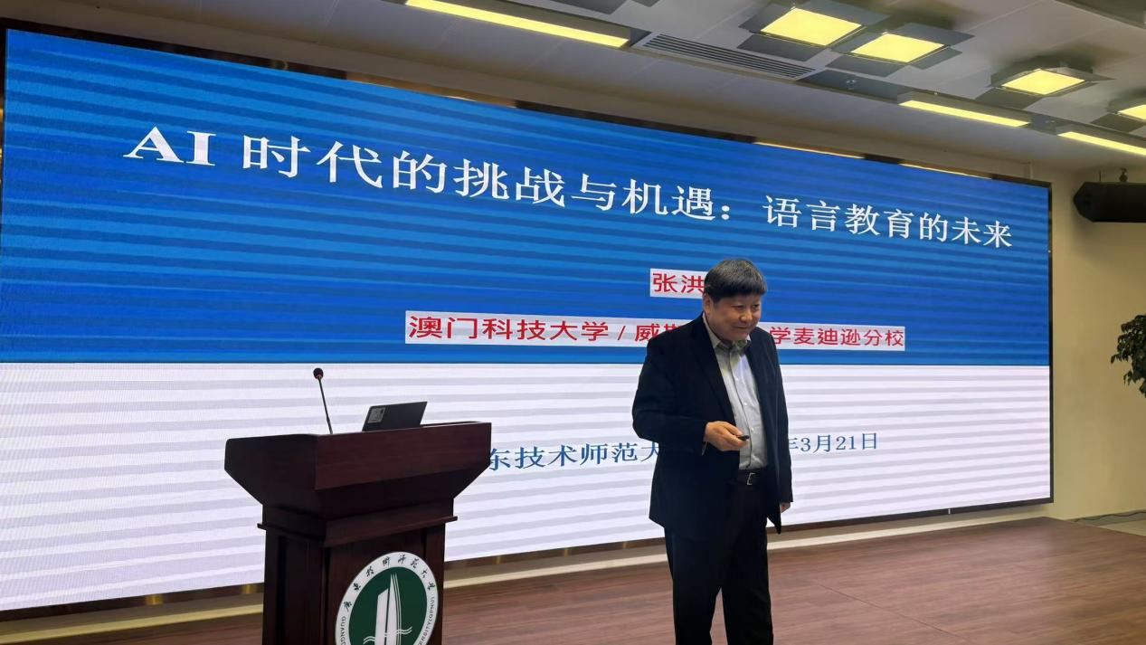 澳门科技大学国际学院院长张洪明教授以“AI 时代的挑战与机遇——语言教育的未来”为题作主旨发言。他回溯了语言教育发展历程,指出AI发展既带来教育转型契机,也对语言专业带来冲击与挑战。通过对比人类大脑运行机制与大语言模型,强调二者存在本质差异。他对AI驱使的语言观表示怀疑,认为AI可以成为人类的工具,而不能取代人类,并以AI翻译与人工翻译的对比为案例证明人工翻译的不可或缺性。