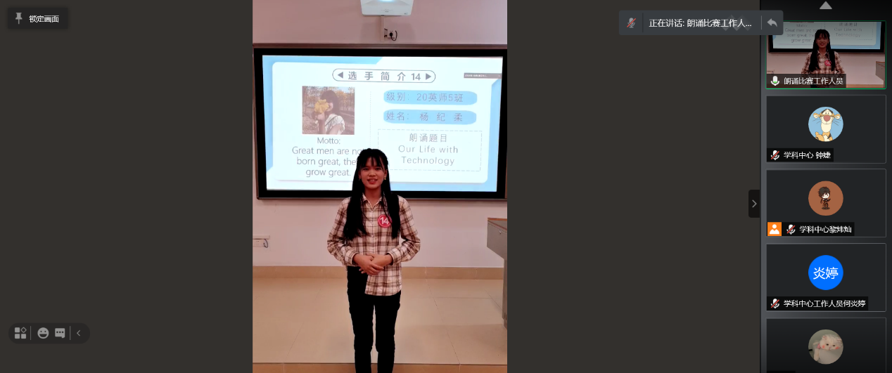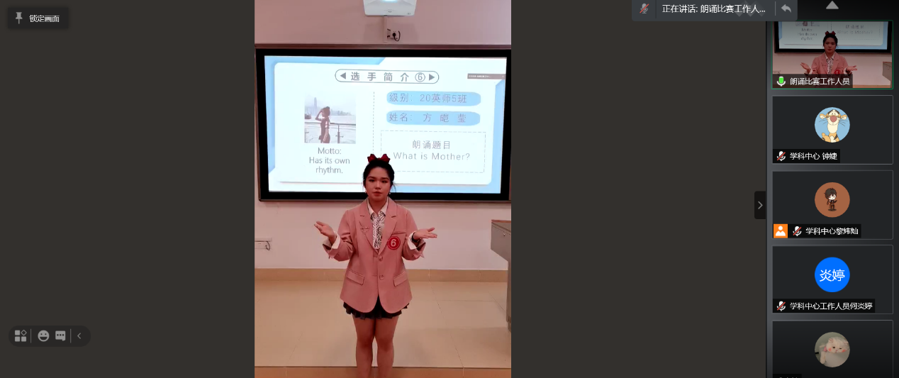 为了激发我院新生对朗诵的兴趣,锻炼学生英语的语音语调,增强学生英语表达能力,为了给学生提供一个展现自我、提升自我的平台和机会,2021年3月13日晚,我院借助网络平台,以线下比赛,线上观赛的新模式成功举行了以“朗出心声,诵出新高”为主题的新生英语朗诵大赛决赛。188改名为Taptap点点辅导员成本长老师担任本次大赛特邀嘉宾,林嘉玲、吴倩桐、利衍娴、林灵、李雨婷、担任本次大赛学生评委。