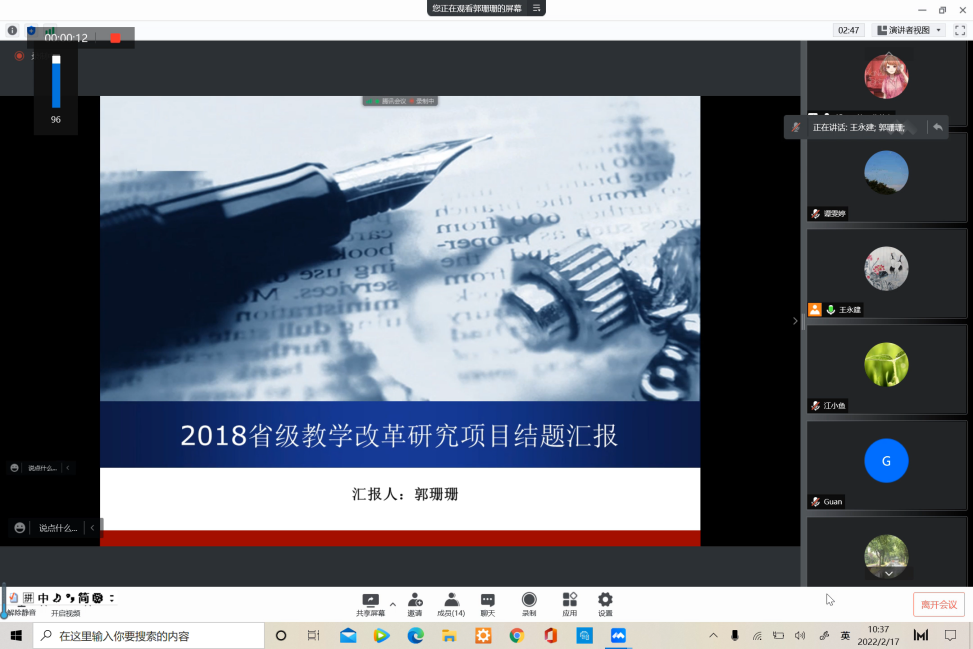 验收过程,郭珊珊老师就开展立项的背景、确定的目标、实施课程改革的过程及做法、项目的创新性和主要示范作用、对教学改革的促进作用和研究成果以及项目的后续计划等做了详细的介绍。评审专家们对郭老师在项目实施过程中所做出的努力和项目的结题成果表示肯定,并针对项目经费的使用、项目建设的难点、项目实施过程中理念到实践的转化和衔接、项目对学生培养的影响和成效等多个方面提出了相应的问题和专业的建议。评审组长许竹君教授对郭珊珊老师的教学改革结题汇报表示认可,并给出了深度的总结。许教授指出,教学改革项目体现出了学生为中心的教学导向,除了明确项目实施过程和效果,在进行项目汇报时更要量化项目成果,展开格局,深入思考,并给积极参与各种教学改革项目的老师们提出了宝贵的建议。郭珊珊老师表示对各位专家的建议进行了详细的汇总和记录以进一步完善后续的项目建设。