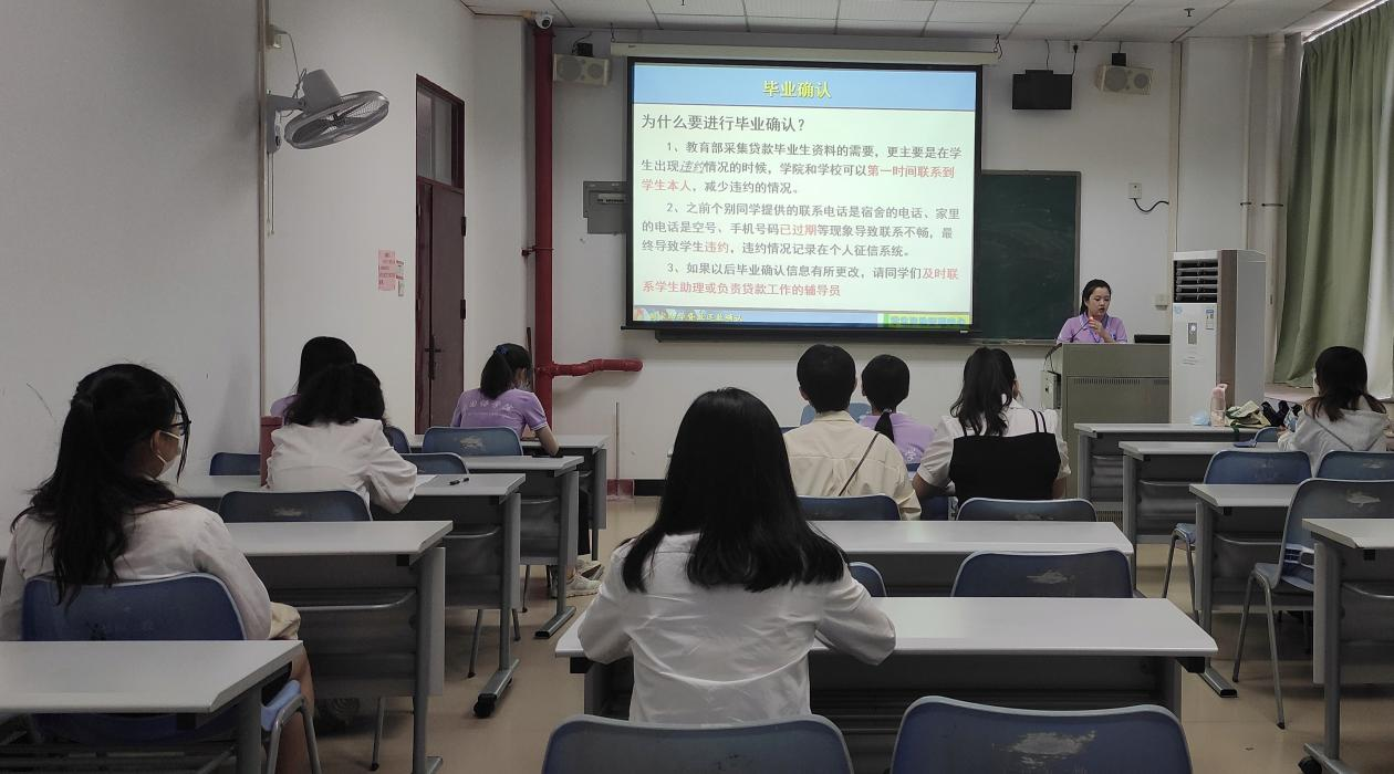 一、关于毕业确认工作的说明:会议上,助学助理林方圆为国家助学贷款毕业生强调了毕业确认工作的重要性:这项工作是教育部采集贷款毕业生资料的需要,主要是为确认对贷款毕业生的身份证号码,电话号码等个人信息,以减少违约的情况。