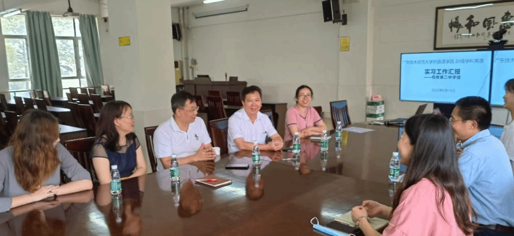 实习生组长黄如慧对实习过程和收获做了详细汇报。首先是英语教学和课堂管理上成长和收获。三位实习生体验了从听课到线下线上两种形式的教学,学校领导和指导老师见证了她们的成长。其次是班主任工作,主要汇报了日常做学生思想工作和参与升国旗等班集体活动。最后是实习生们积极融入其他教师的体育活动和宿舍日常。