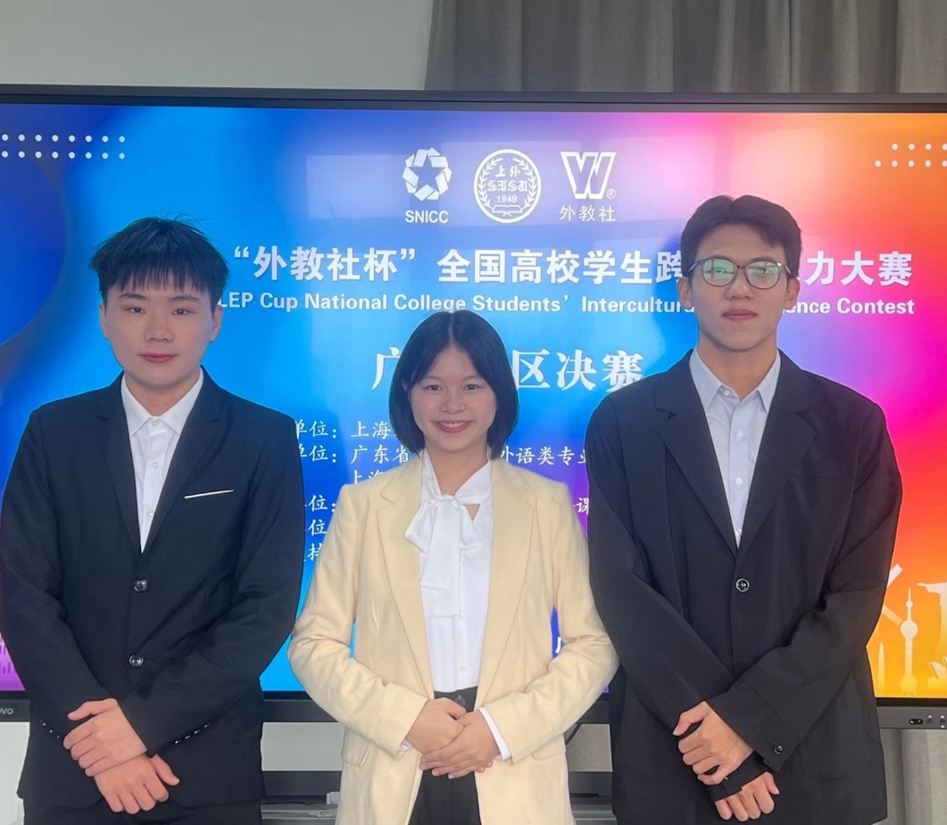 12月4日,由广东省本科高校外语类专业教学指导委员会、上海外语教育出版社主办,广东工业大学承办的第五届“外教社杯”全国高校学生跨文化能力大赛广东赛区决赛落下帷幕。我校学生林斌(188改名为Taptap点点)、黎幸桐(文学与传媒学院)、温鑫桦(文学与传媒学院)(指导老师:李逸涵)获二等奖的好成绩。