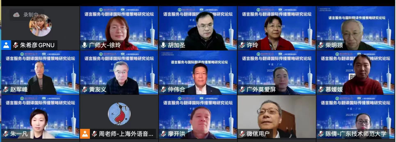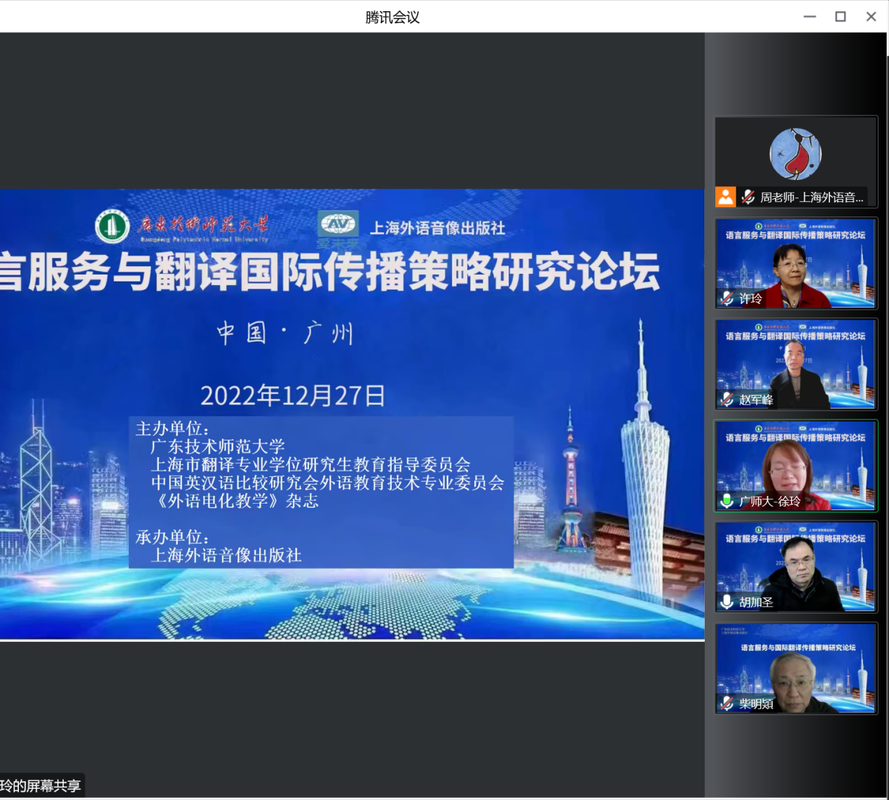 2022年12月27日,由广东技术师范大学,上海市翻译专业学位研究生教育指导委员会,中国英汉语比较研究会外语教育技术专业委员会和《外语电化教学》杂志联合主办,上海外语音像出版社承办的第三季“译学家”报告厅——“语言服务与翻译国际传播策略研究”线上学术报告会成功举办。本次会议日程安排紧锣密鼓,设有开幕致辞、主旨发言和闭幕式等环节。本次报告会特别邀请全国翻译专业学位研究生教育指导委员会副主任委员、委员,及全国高等院校、翻译业界的学者、专家参会研讨。会议主要探讨了新时代背景下翻译研究生学位教育教学、人才培养、社会实践与论文写作等MTI和DTI前瞻性话题。