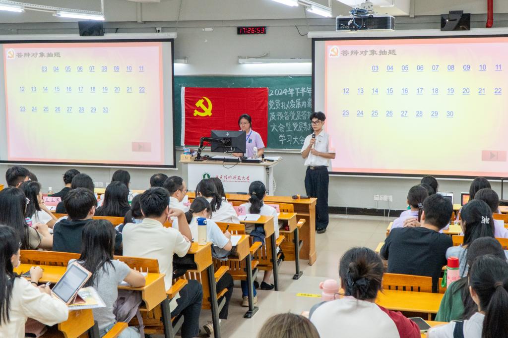 大会在庄严的国歌声中拉开帷幕。23位党员发展对象和5位预备党员依次上台,围绕自身的思想政治素养、学习情况、在校期间发挥先锋模范作用的情况、入党后在党组织中发挥作用的决心与打算等方面,汇报了自身在校期间的成长进步、不足之处及未来规划。在答辩过程中,同学们纷纷表示,将继续坚守初心和使命,以更高的标准要求自己,不断加深对党的理论和路线方针的理解和实践,用实际行动表达自己向党组织靠拢的决心和愿望。在抽题作答和评委提问环节,答辩对象围绕党章理论学习、时政热点等进行阐述。