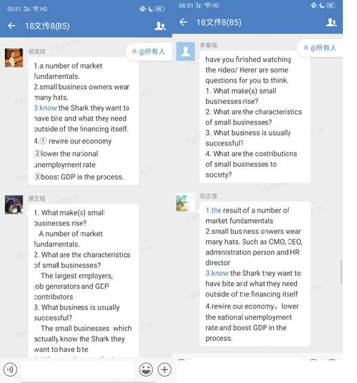 图1 李春晓老师课堂上学生对于视频和教师提问的内容进行积极的讨论和回答