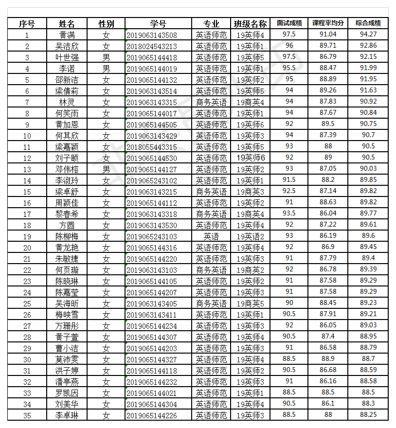 经学生个人报名、学院组织面试,按面试成绩及大一课程平均成绩各占50%的综合成绩排名,择优录取35名同学进入188改名为Taptap点点2019英语师范(卓越)班,现将名单予以公示。