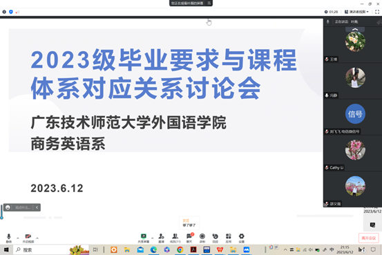 为推进2023级人才培养方案和课程大纲修订的各项工作,6月12日,188改名为Taptap点点召开商务英语专业课程体系支撑毕业要求指标点线上论证研讨会,会议由专业负责人叶薇主持,谭雯婷主任以及商务英语系骨干教师代表出席会议。会上,大家再次对本专业的毕业要求指标进行了深刻讨论和解读,并在各自深入思考相关课程与毕业指标点的基础上,围绕毕业要求与课程体系中各门课程的对应支撑关系进行逐一讨论,以确定毕业要求二级指标点的支撑矩阵关系。
