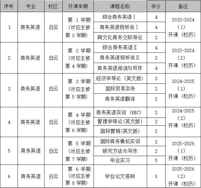 2.商务英语辅修专业/学位课程设置及教学安排如下:
