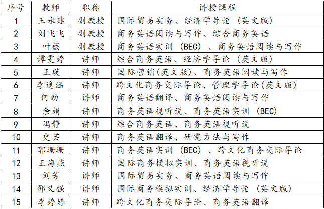 本辅修专业教学经验丰富的教师担任任课教师,已经形成了一支包括商务英语听说课程团队、商务英语读写译课程团队、商务英语专业课程团队的优秀教师队伍,深受各届辅修专业同学欢迎。