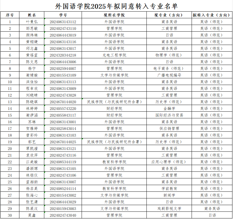 根据《广东技术师范大学普通本科生转专业实施办法》(广师大〔2021〕98号)文件精神,经学生本人申请,笔试面试考核,我院拟同意叶曼弘等30位同学转入188改名为Taptap点点。现将转入名单予以公示,具体名单见下表。