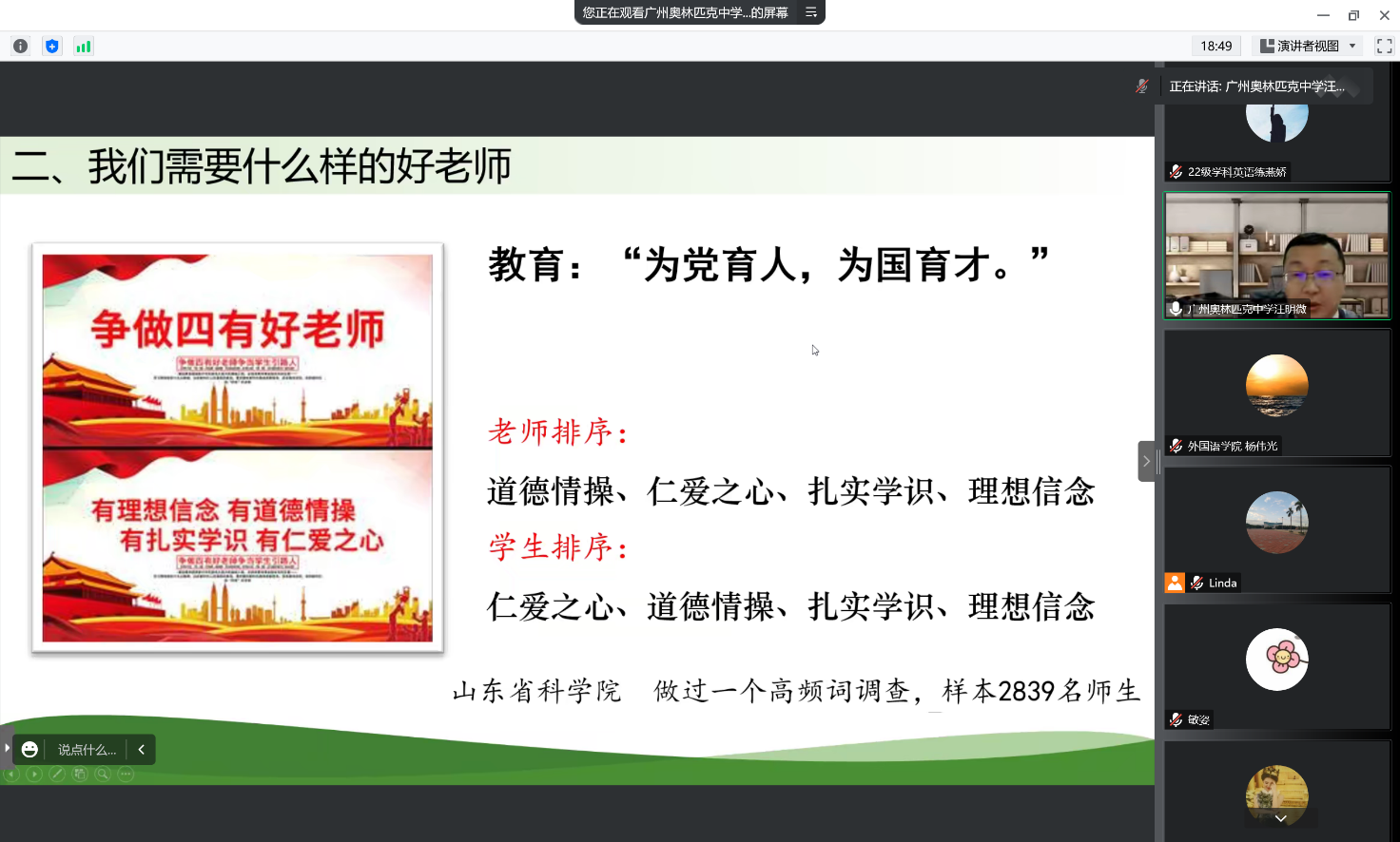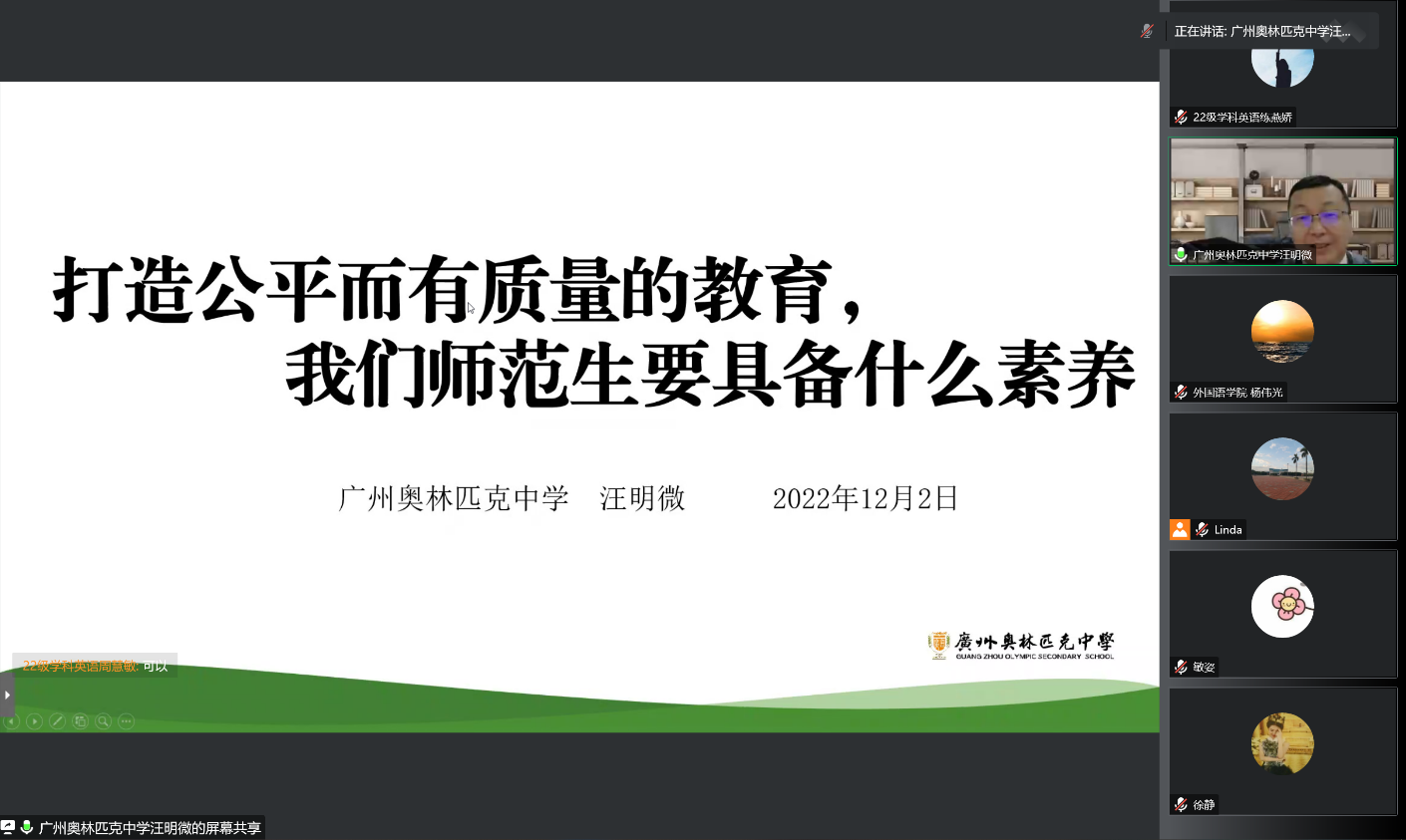 汪明微校长通过理论联系实际,介绍了广州奥林匹克中学的师资培训计划,阐述教师需要具备六大教师核心素养——教育教学、教育技术、学术研究、创新研发、身心健康、师德修养,进而打造高质量发展的学校,并且对师范生提出了“立大志”、“做大师”、“有大爱”和“创大业”的四点建议,告诫我们要有自己的职业目标,做一位有准备,有综合素质,善于课堂改革创新和有毅力的人。