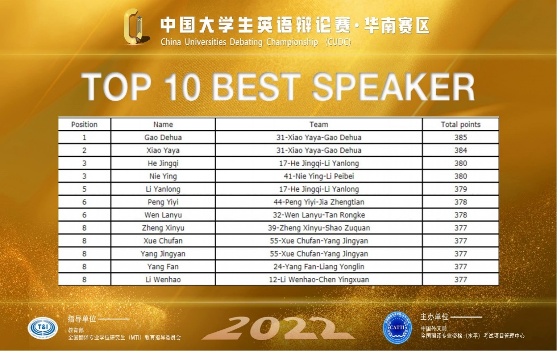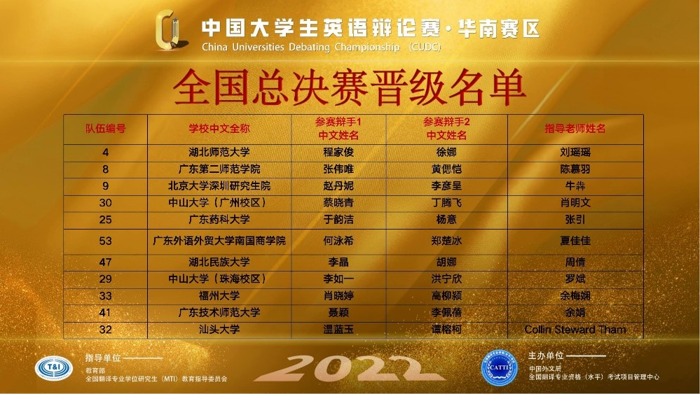 2022年9月24至25日,全国大学生英语辩论赛(China University Debating Championship CUDC)华南区比赛于线上举行。我校英语系2019级学生聂颖和20级学生李佩蓓(指导老师:余娟)经过5轮循环赛获得华南区赛二等奖,顺利晋级全国总决赛,同时参赛选手聂颖同学还获得了华南赛区十佳辩手的荣誉。
