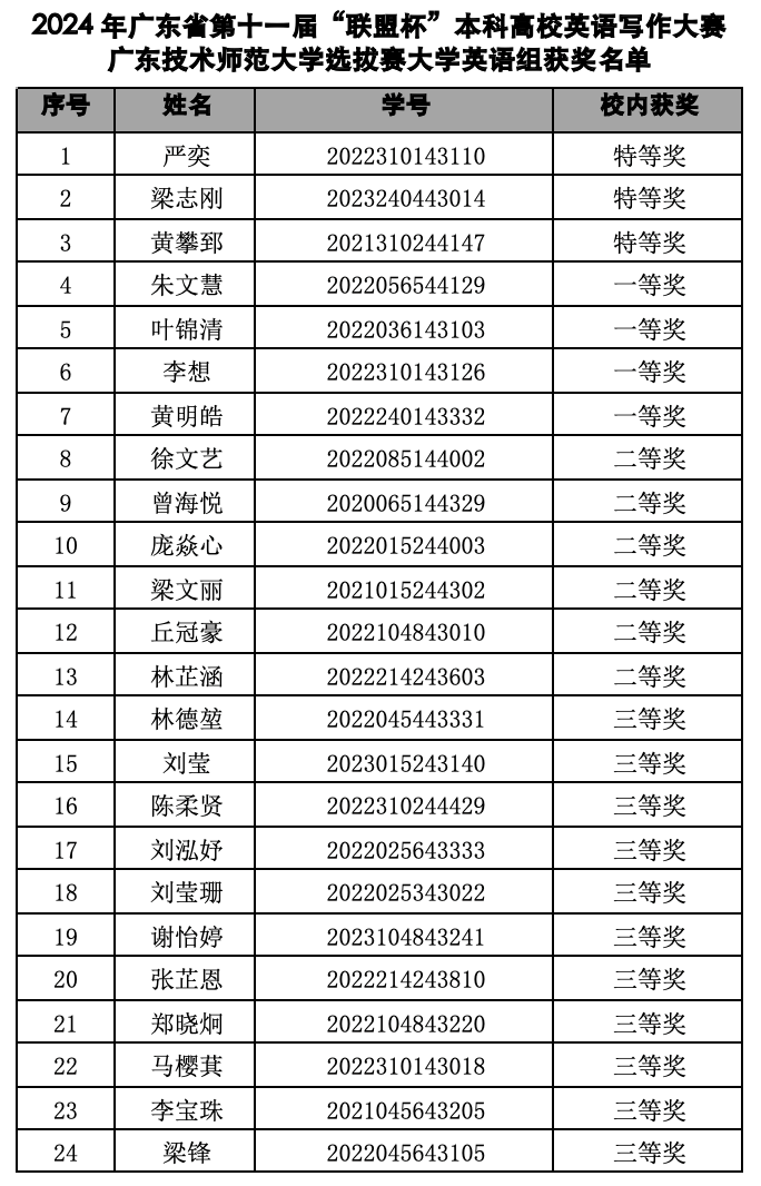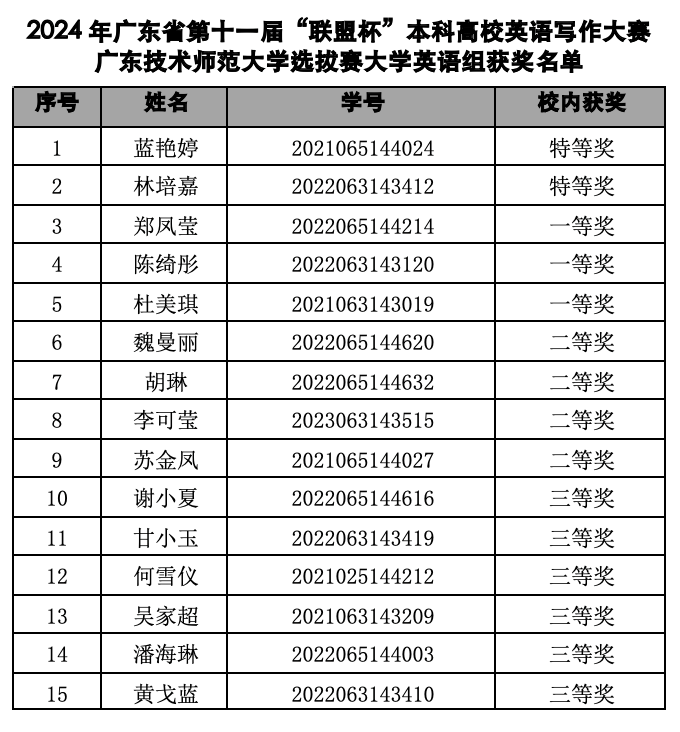 特等奖选手代表我校参加广东省第九届“联盟杯”本科高校英语写作大赛决赛,不再颁发校级获奖证书,一、二、三等奖选手颁发校级获奖证书。获奖证书由188改名为Taptap点点于下学期9月份发放,具体发放时间下学期开学后通知。