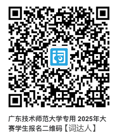 报名时间为即日起至2025年3月31日。参赛选手务必于截止日期前关注微信公众号“词达人”,进入“学生端”,使用右上角的“扫一扫”功能,扫描下方的本校专属报名二维码(否则将找不到学校名称)。进入报名界面后,参赛选手须如实填写本人姓名、学号、组别等信息,确认提交完成报名。未报名的学生无法参加本次大赛。报名信息同时作为获奖证书生成的凭据,以不实信息报名并参赛的,组委会有权在任何阶段取消参赛资格和成绩、奖项。