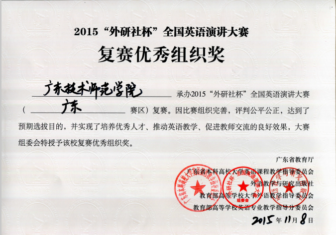 2015外研社杯全国英语演讲大赛复赛优秀组织奖
