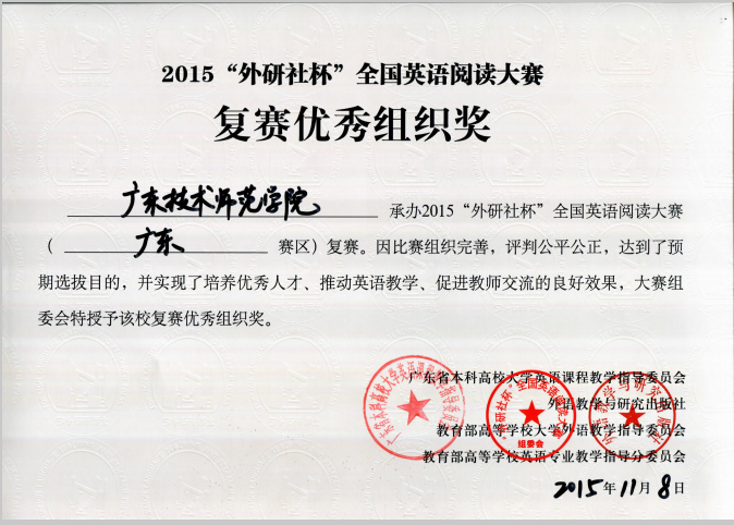 2015外研社杯全国英语阅读大赛复赛优秀组织奖